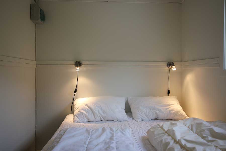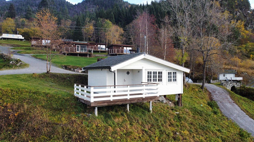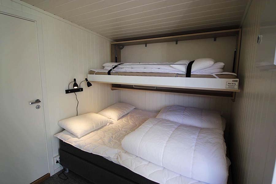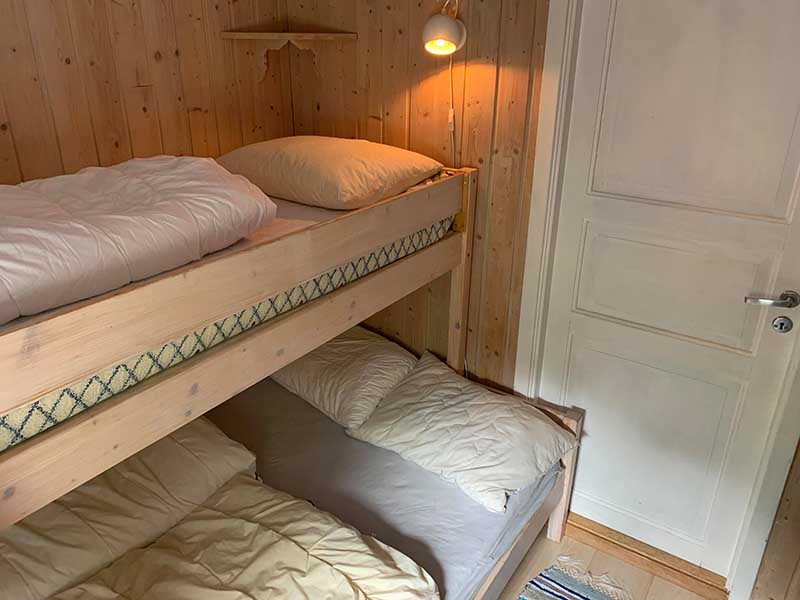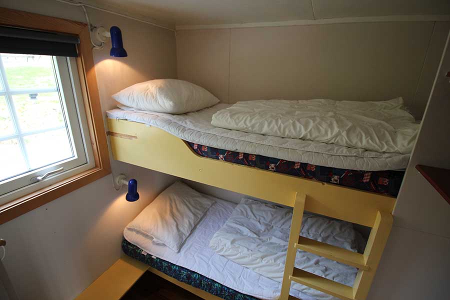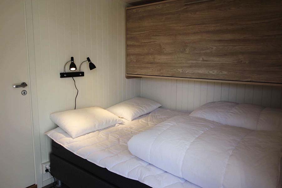 Hytte nr. 2 – 6 passer perfekt for en familie på tur. Denne type hytte har to soverom, et soverom med en dobbeltseng på 150cm og et soverom med køyeseng som passer perfekt for barn. Hyttene har egen parkering ved hytta, og egen inngang. Hyttene har også eget bad med dusj, enkel kjøkkenkrok og stue med veranda. Hyttene er utstyrt med alt av bestikk, koppe og kar, kjøleskap, vannkoker, kaffetrakter og kokeplater.