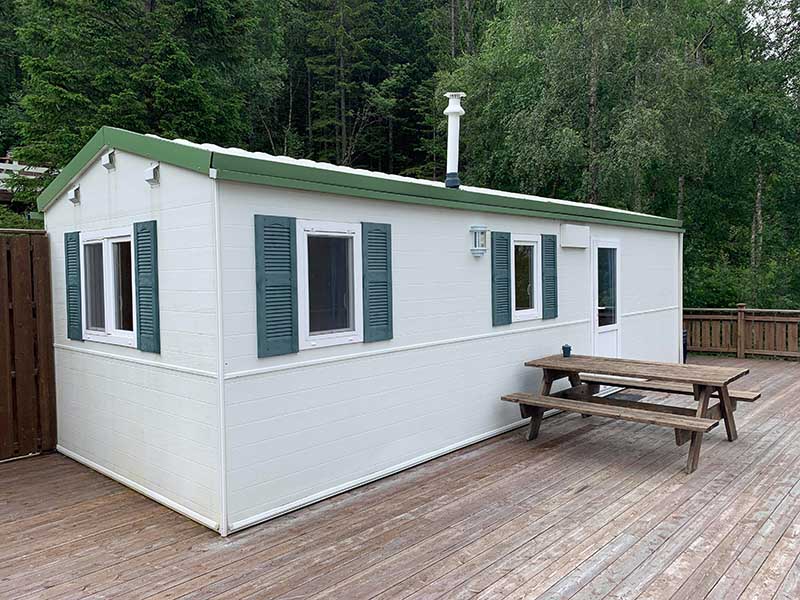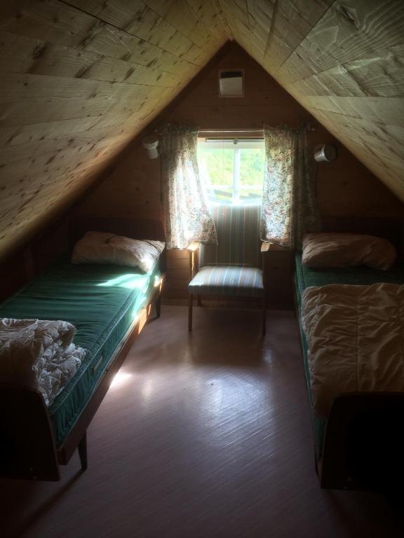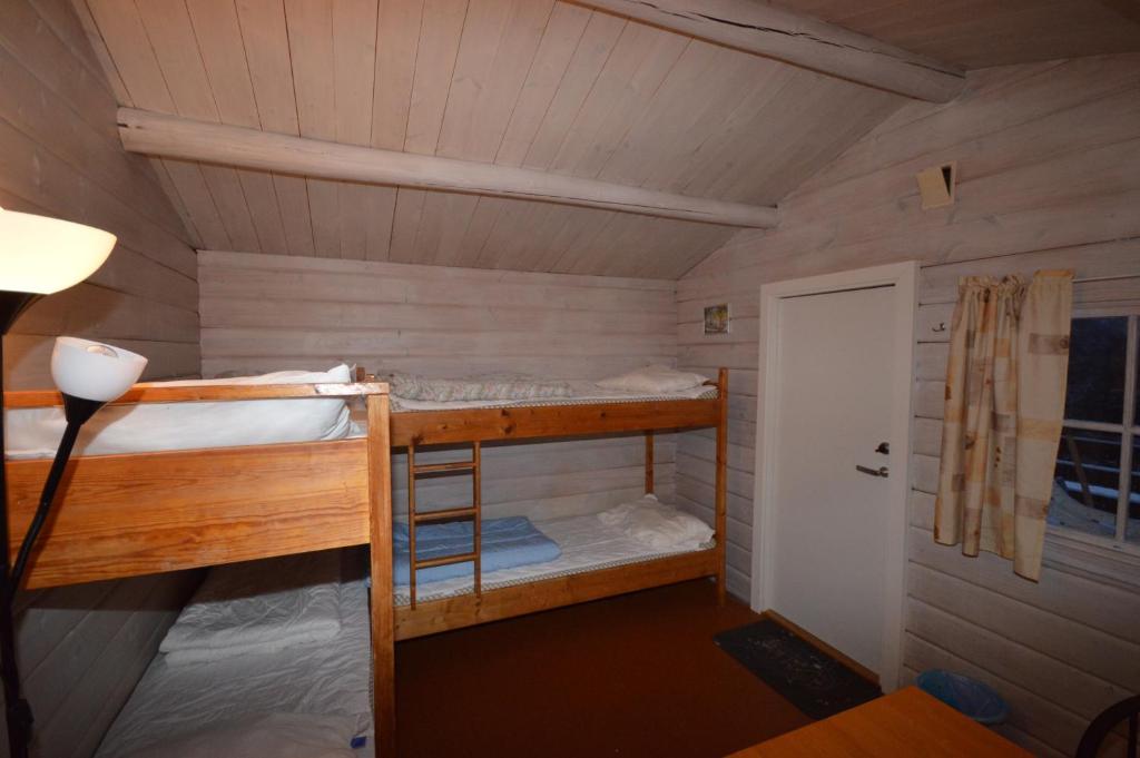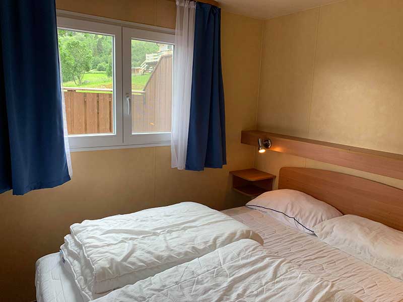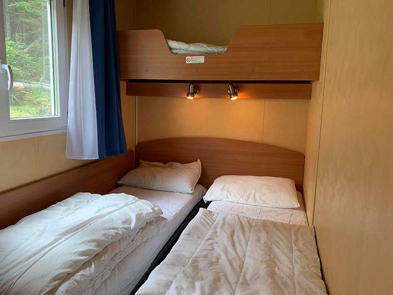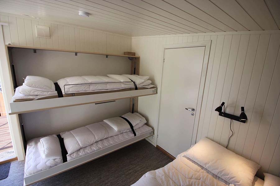 Hytte nr. 2 – 6 passer perfekt for en familie på tur. Denne type hytte har to soverom, et soverom med en dobbeltseng på 150cm og et soverom med køyeseng som passer perfekt for barn. Hyttene har egen parkering ved hytta, og egen inngang. Hyttene har også eget bad med dusj, enkel kjøkkenkrok og stue med veranda. Hyttene er utstyrt med alt av bestikk, koppe og kar, kjøleskap, vannkoker, kaffetrakter og kokeplater.