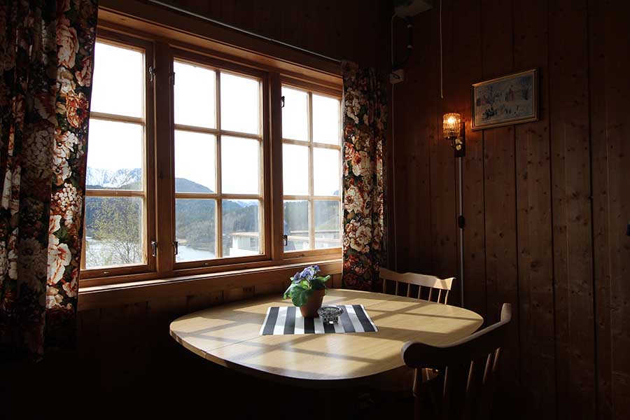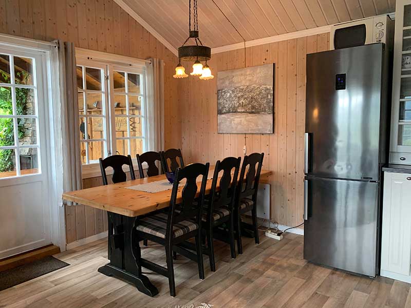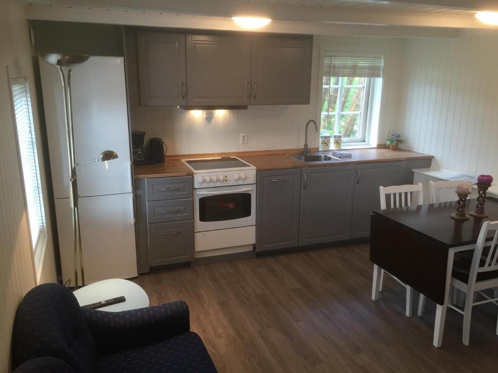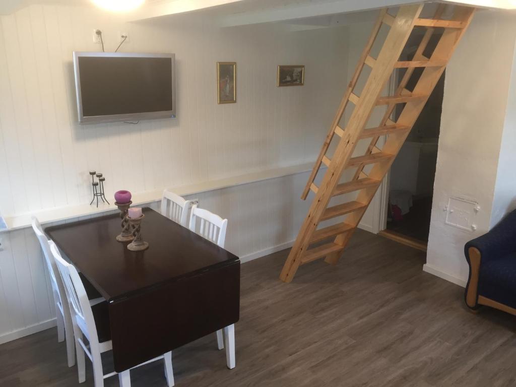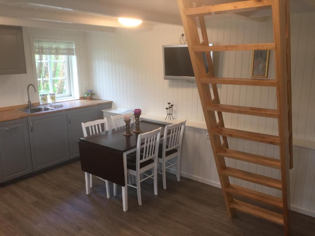 Denne leiligheten har to etasjer. I hovedetasjen finner vi to senger på 180cm (den ene av disse er to enkeltsenger satt sammen, så mulig å dra fra hverandre om ønskelig), spisebord, kjøkken utstyrt med kjøleskap med fryser i topp, komfyr, vannkoker, kaffetrakter, oppvaskmaskin og alt man skulle trenge for å lage et deilig hjemmelaget måltid, eget bad med dusj, sittehjørne med sofa og stoler og TV med over 60 kanaler. I andre etasje finner man en enkeltseng. Leiligheten ligger i hovedhuset og deler hovedinngang med 5 andre leiligheter. Parkering ved felles parkeringsplass rett ved hovedhuset.