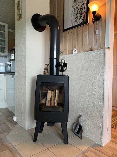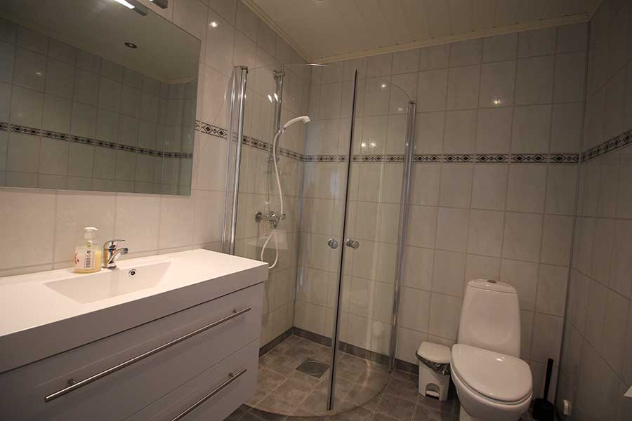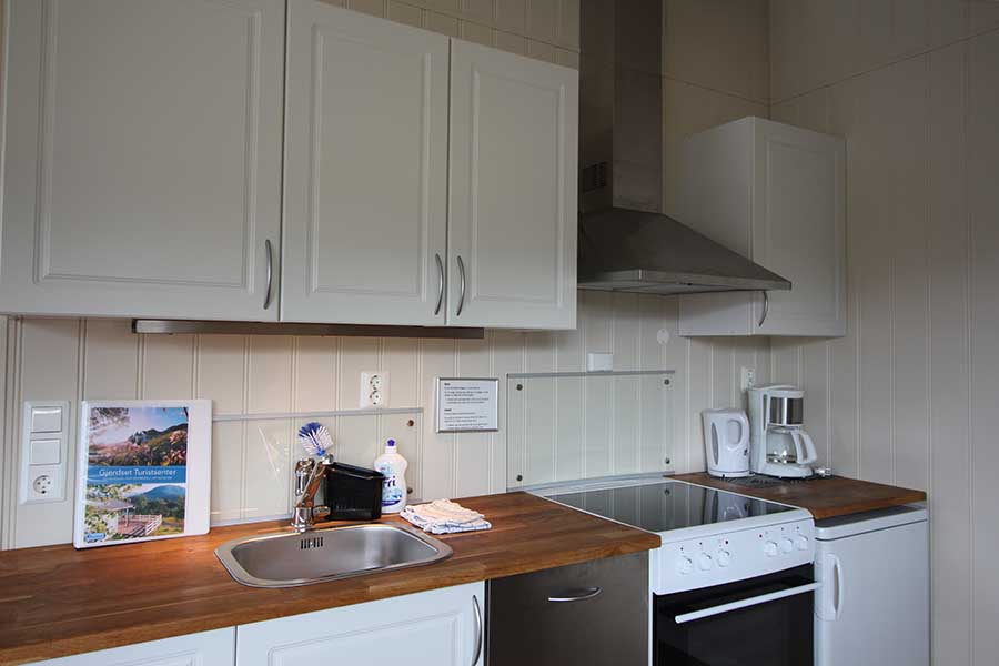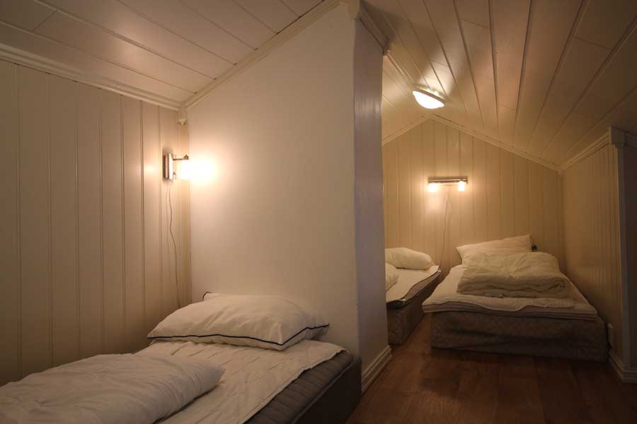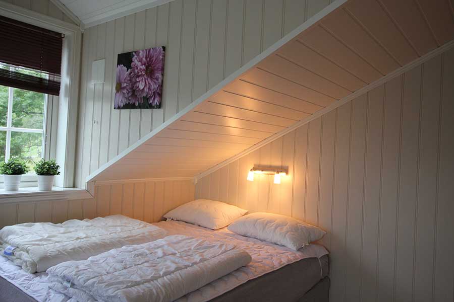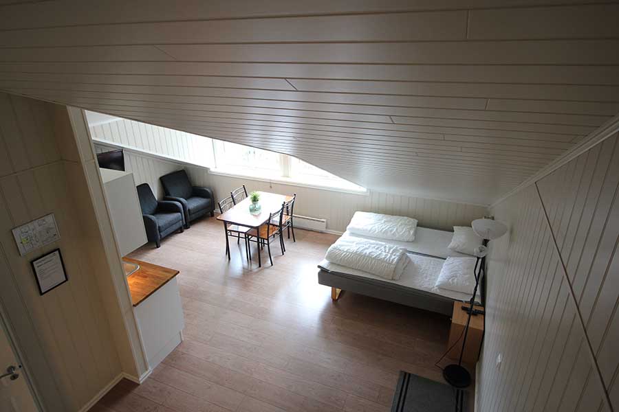 Denne type leilighet har to etasjer. Hovedetasje består av kjøkken utstyrt med kjøleskap med liten fryser i topp, oppvaskmaskin, kaffetrakter, vannkoker og alt man skal trenge for å lage et deilig hjemmelaget måltid, eget bad med dusj, dobbeltseng på ca. 180cm (to enkeltsenger satt sammen som enkelt kan dras fra hverandre om ønskelig), spisebord, sittemøbler og TV med over 60 kanaler. I andre etasje (nærmere sagt en hems)  finner man tre enkeltsenger. Leilighetene ligger i hovedhuset og deler hovedinngang med 5 andre leiligheter. Parkering ved felles parkeringsplass rett ved hovedhuset.