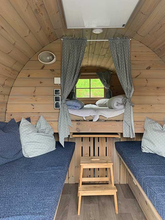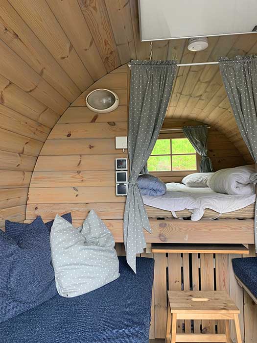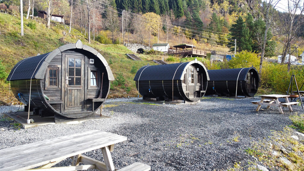 Disse tre unike tønnehyttene har plass til to personer i hver hytte. Disse er våre mest populære hytter, trolig på grunn av sin utforming og simplisitet. Det er seng i bakre del av hytta på ca. 180cm. I front finner vi en benk på hver side og et bord man kan dra ut fra under sengeområde. Hver hytte har privat bålpanne og rastebord, i tillegg til felles utekjøkken rett i nærheten. Dusj og toalett finner man i sanitæranlegget som også er like i nærheten. Parkering i nærheten av hyttene.